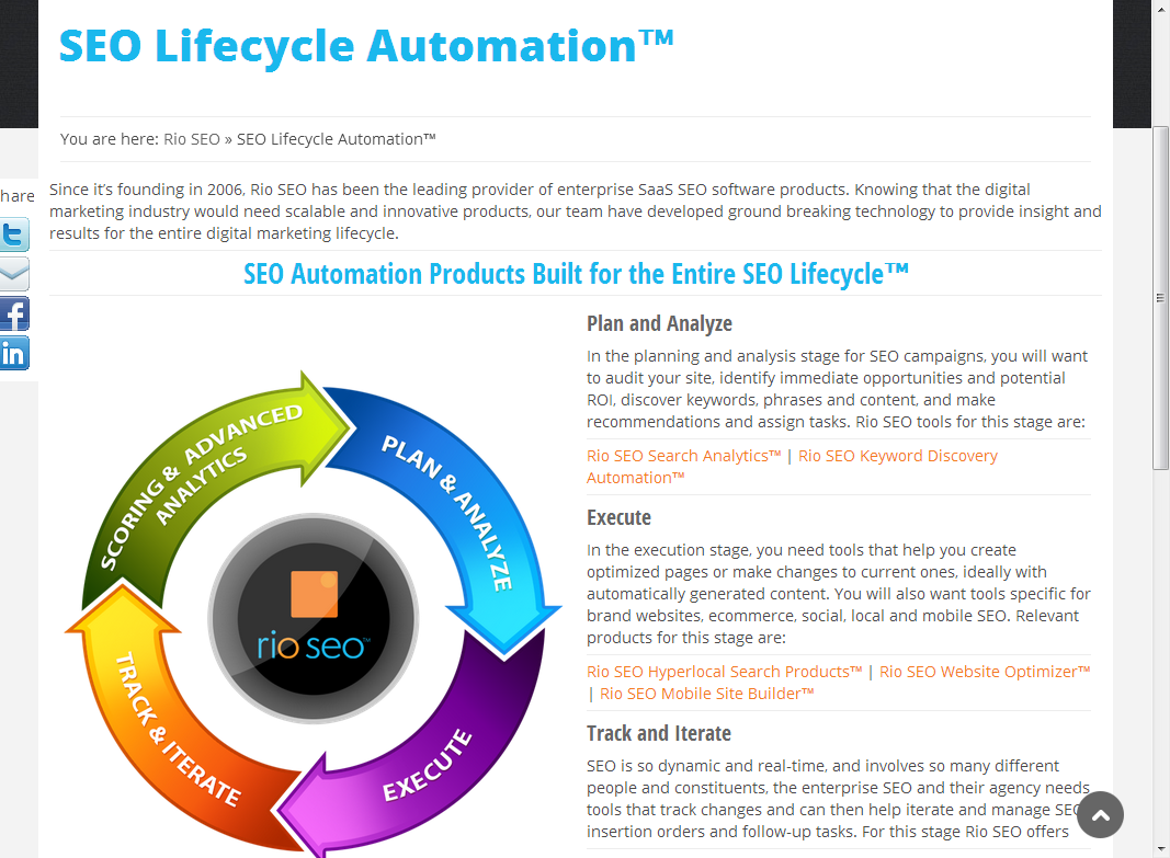 3,www.rioseo.com。rioseo提倡SEO生命周期的自動化,提供了關鍵詞發現,SEO變化趨勢跟蹤,本地化搜索,站內優化,手機站生成,社會化媒體信息統計等模塊。